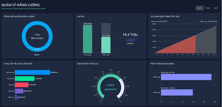 Hệ thống cung cấp dữ liệu năng lượng trực tuyến với độ chính xác cao, bao gồm lượng điện năng tiêu thụ (kWh), chi phí điện năng tương ứng, và ước tính lượng phát thải CO₂ dựa trên hệ số phát thải của lưới điện Việt Nam. Các thông tin này được cập nhật liên tục và hiển thị trực quan qua các biểu đồ đường, biểu đồ cột, và bảng số liệu.